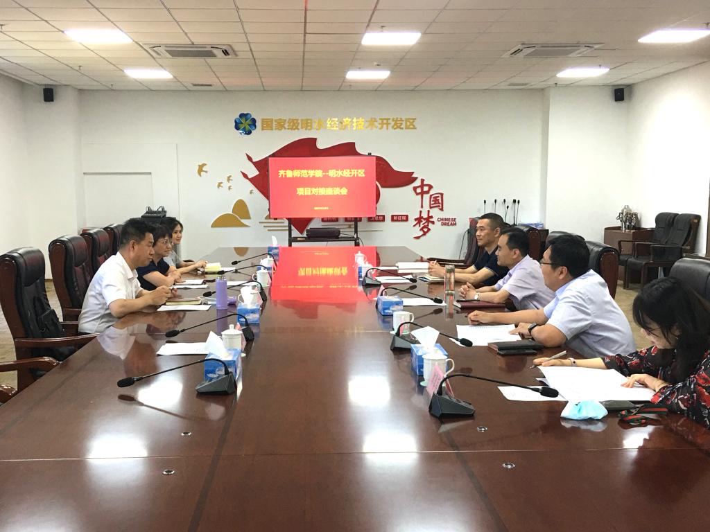 5月30日下午,外国语学院赴明水经济技术开发区开展合作对接座谈会。会议由明水经济技术开发区党工委委员、管委会副主任郎咸颖主持,明水经济技术开发区科技人才部部长王许、山东易速通国际贸易有限责任公司总经理闫钡、齐鲁师范学院合作发展办公室主任刘勇、外国语学院院长宋秀葵、商务英语专业教研室主任石磊、办公室副主任汪洁出席会议。