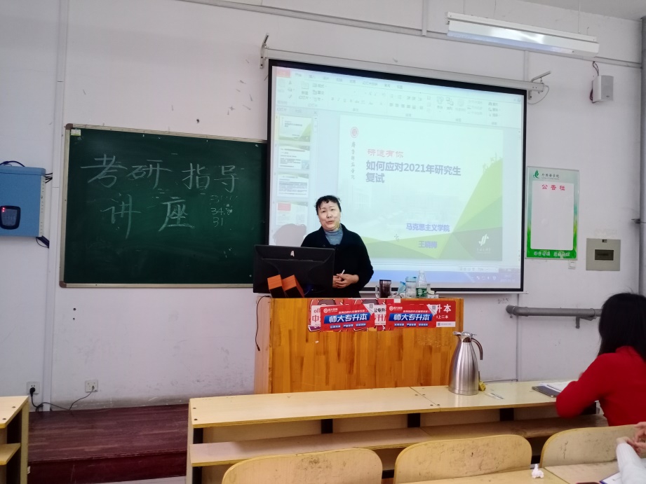 随后,针对当前疫情形势,王书记提出今年也极有可能采用网络复试的形式。根据去年网络复试的情况,王书记分析了网络复试的优劣势,讲解了网络复试的要求,提示同学们要吸取去年网络复试的经验教训,注意硬件要求。接着,王晓梅书记着重强调了调剂的重要性,并结合去年和今年考研人数、考生分布,对报考方向和调剂方向做了指导。她指出,面对调剂,同学们一定要正确做出选择,尤其是分数较低的同学更要时刻注意调剂方向。王书记详细讲解了如何更好地把握调剂机会,鼓励同学们互相帮助,更好地为复试做好准备。最后,郁书记做了简单的总结,鼓励同学们好好准备接下来的复试,分数较低的同学也不要灰心,认真把握机会,争取被心仪的学校录取。本次考研指导讲座在热烈地掌声中圆满结束。