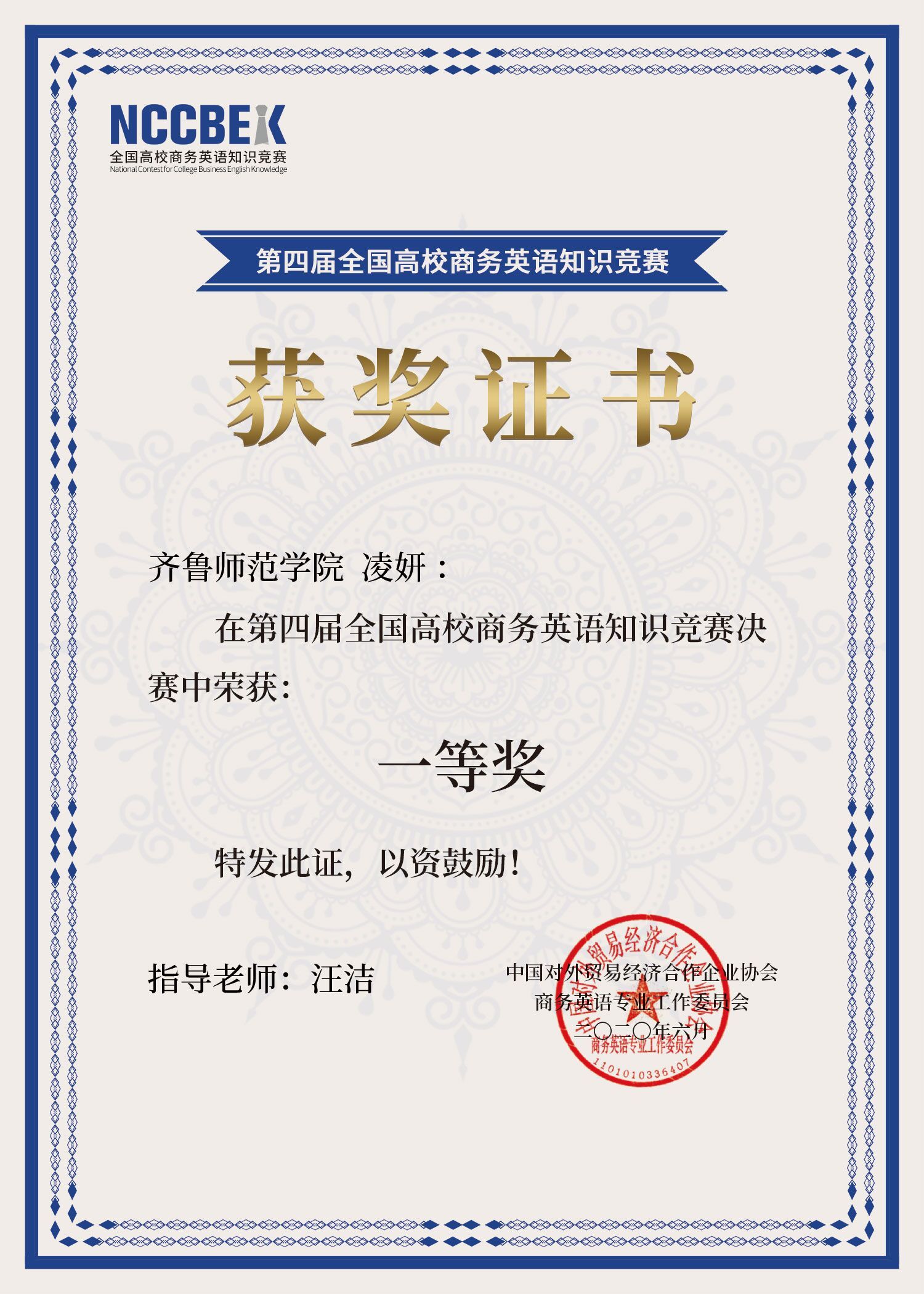 我校学生代表队共89名选手参赛,通过指导教师的悉心指导和学生的认真备赛,19级商务英语(本科)1班凌妍获得全国决赛一等奖,18级商务英语(专科)1班侯璐璐、19级商务英语(本科)1班赵静、19级商务英语(专科)3班杨家毅、18级商务英语(专科)1班耿梦娜获得全国决赛二等奖。外国语学院孙建华老师、汪洁老师获得竞赛优秀指导教师奖。