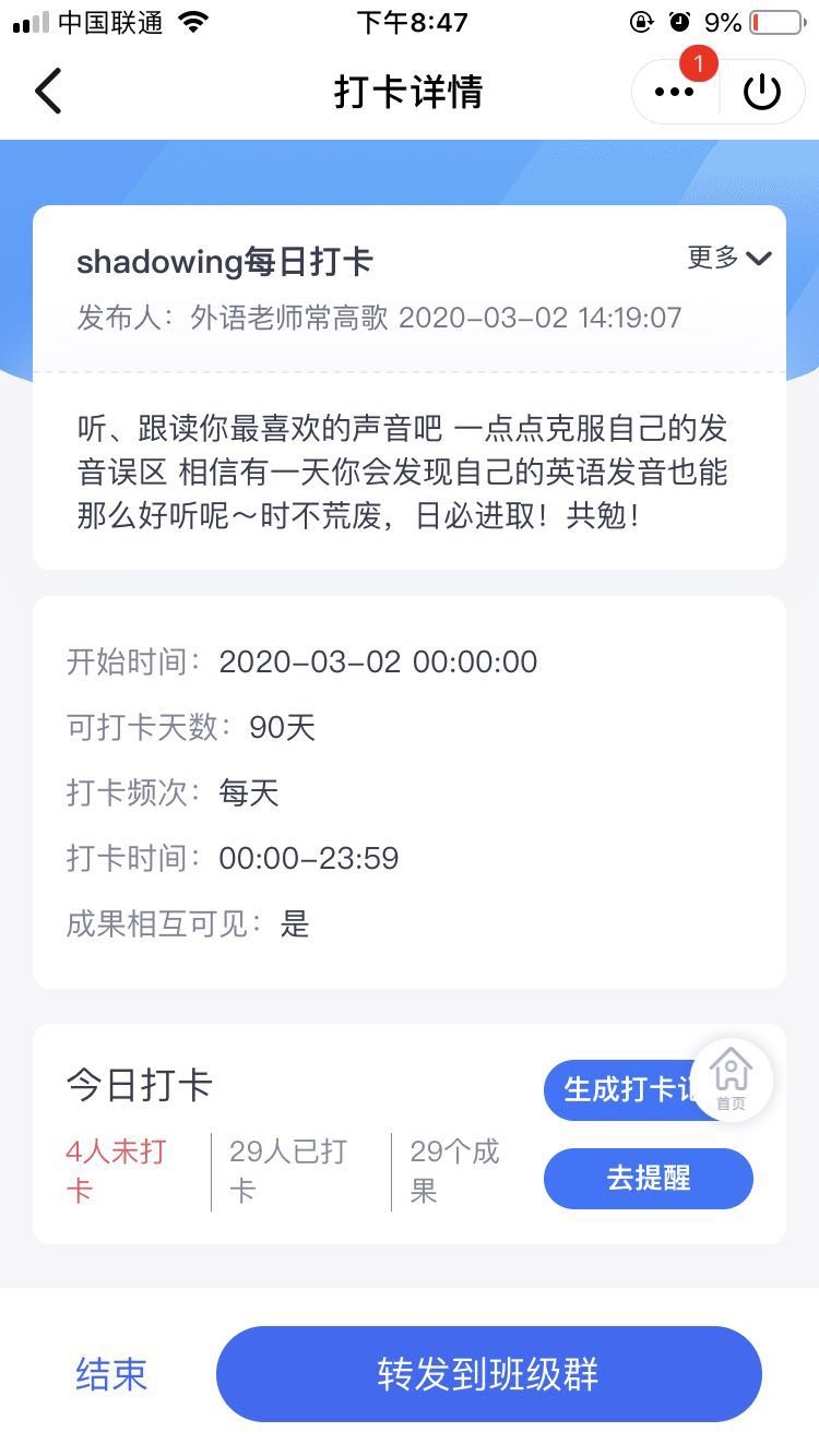 (图为常高歌老师分享学生“跟读”打卡任务)