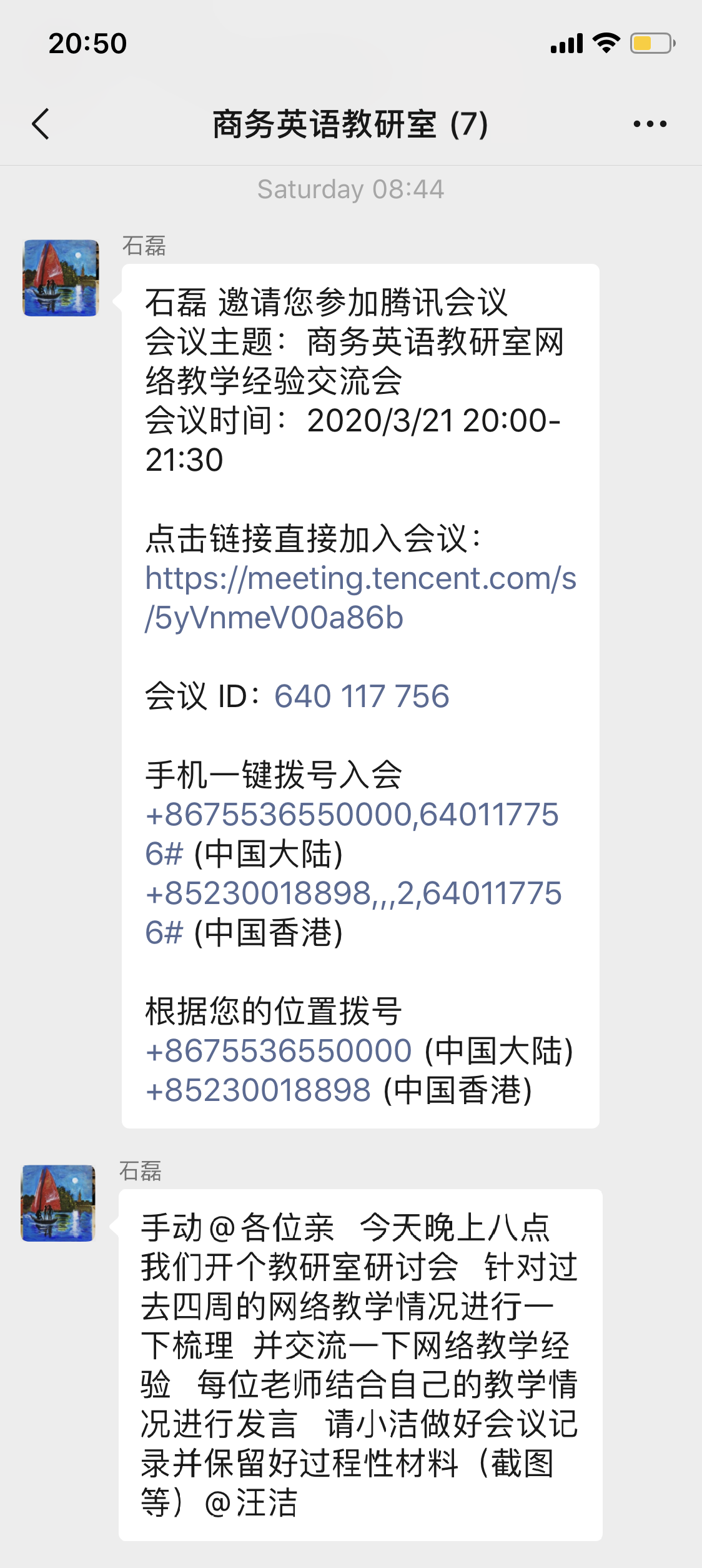 为积极响应教育部、山东省教育厅和学校关于做好防疫期间教育教学工作的统一部署与要求,贯彻落实外国语学院的工作安排,切实做好本学期线上教学工作,确保防疫期间的教育教学质量,商务英语教研室于3月21日晚上8点通过“腾讯会议”平台召开了线上教学经验分享交流会,对开学以来前四周的线上教学工作进行总结,分享经验,促进交流。学院商务英语教研室全体教师参加,商务英语教研室主任石磊主持会议。