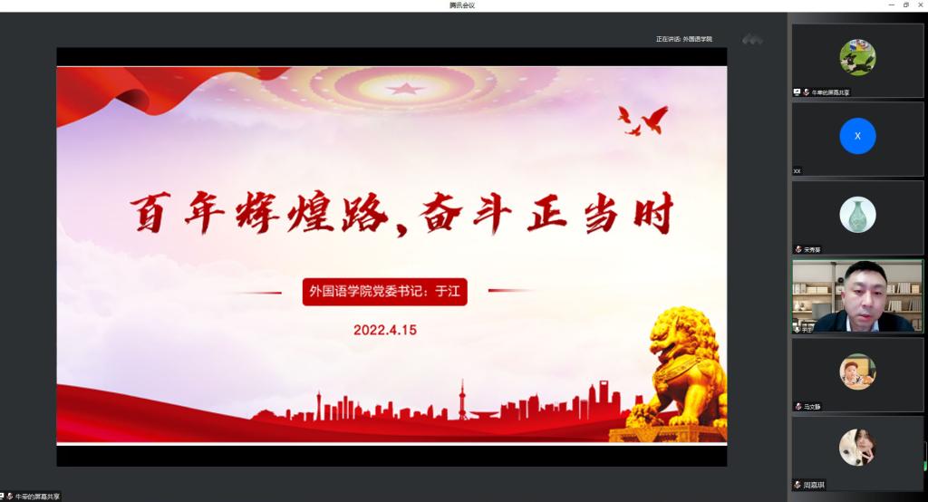 为帮助同学们强化使命担当、坚定理想信念,接力引领未来。2022年4月15日晚,外国语学院党委书记于江为学院全体学生讲授思政课,此次思政课采用线上的方式进行。
