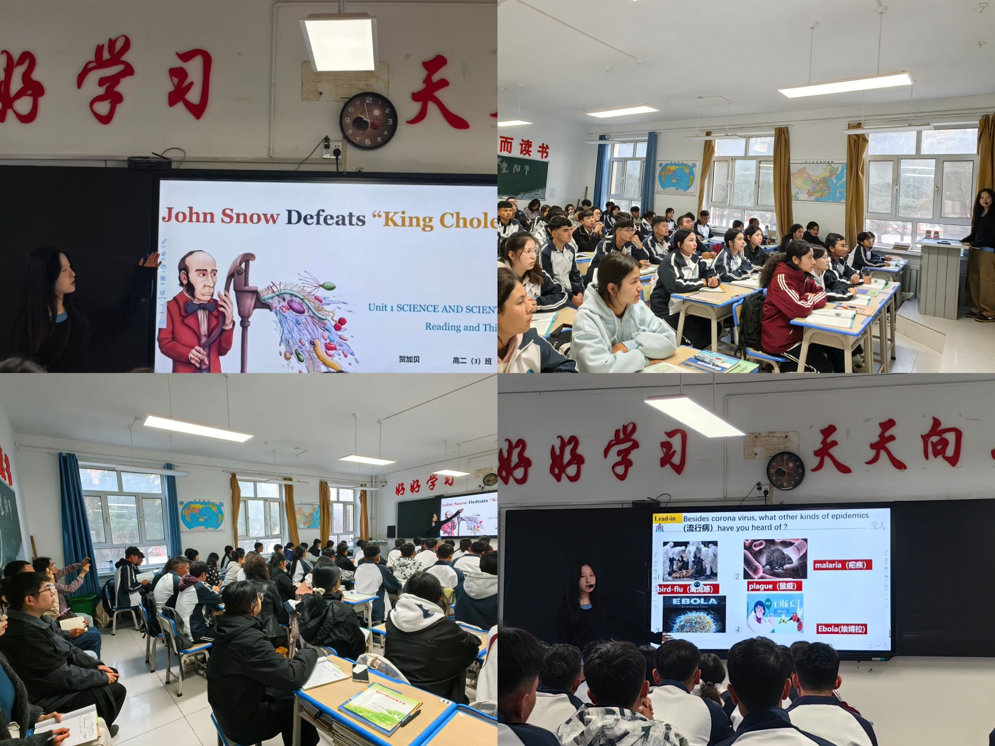 当天上午,王冰新与四位带队老师先是一同观摩了英语专业实习支教学生贺加贝的公开课“John Snow Defeats King Cholera”一课。课后,大家对这堂公开课给予了高度的肯定。