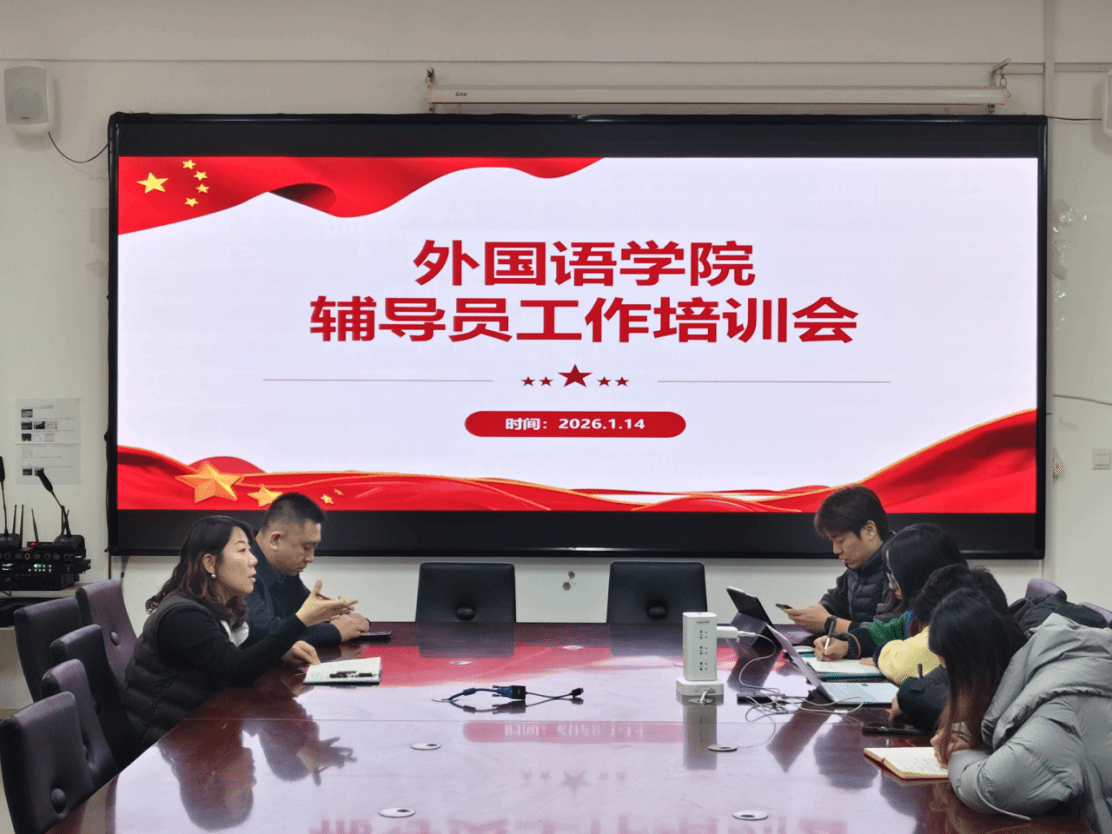 为提升辅导员队伍业务能力与履职效能,切实筑牢学生工作根基,全面落实新时代党的建设总要求和新时代党的组织路线,1月14日,外国语学院组织召开辅导员工作专题培训会。学院党委书记于江、党委副书记迟英娟出席会议并讲话,团总支书记牛荦及全体辅导员参加会议,会议由于江主持。