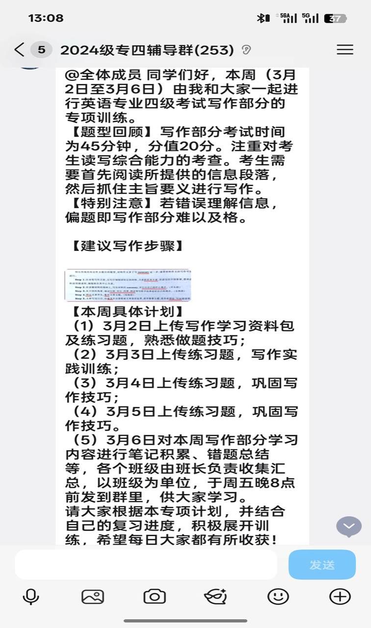 本次寒假专四辅导以“一周一专项,步步为营”为原则,依托年级辅导群,由学院专业教师全程指导,围绕专四考试大纲,系统推进听力、词汇、语法、阅读及写作五大模块训练。张晓蕾老师负责听力专项,通过上传学习资料、讲解解题技巧、结合真题训练,有效提升了学生的听力理解能力。后期,辅导重点转向词汇、语法与阅读模块,教师通过每日打卡、资料共享和笔记整理等方式,引导学生持续拓展训练,夯实语言基础。陈乐老师在摘要写作专项中,重点讲解写作规范与要点,建议学生深入研读历年真题范文,帮助大家克服写作畏难情绪,掌握写作精髓。每周末,各班班长或学习委员负责收集整理本班同学的专项笔记并上传至群内,即便于教师掌握学习情况,也促进了班级之间的学习交流与经验分享。
