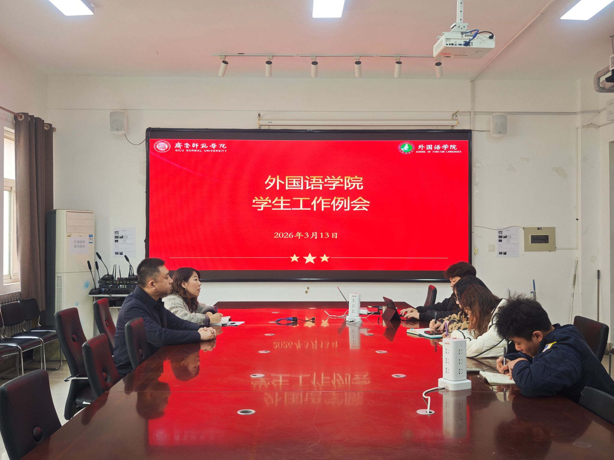 3月13日上午,外国语学院召开新学期学生工作例会,专题传达学习学校共青团工作会议、学生工作会议精神,部署意识形态风险防控及新学期学生工作重点。学院党委书记于江、党委副书记迟英娟,团总支书记牛荦及全体辅导员参加会议。会议由迟英娟主持。