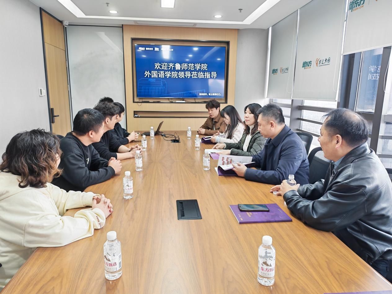随后,学院一行到访济南新东方前途出国,受到企业负责人徐传鑫、刘召森及各项目板块负责人的热情接待。双方聚焦国际教育服务领域,围绕人才培养方向、就业岗位拓展、专业能力适配等关键内容开展细致研讨。企业方全面介绍了留学服务、语言培训、国际职业规划等核心业务的发展现状与人才需求,明确青睐精通外语、熟悉国际规则,且具备市场拓展与客户服务能力的毕业生。谢士金结合学院专业特色针对性提出校企合作课程共建、邀请企业导师进校园开展职业指导、组织学生参与行业实践项目等合作建议。于江表示,希望以校企合作为纽带,帮助在校生提前明晰职业发展方向、提升就业核心竞争力,同时为毕业生开拓国际教育领域的优质就业岗位。经深入交流,双方就联合开展就业宣讲、建立毕业生实习推荐机制、探索跨境语言服务人才联合培养模式等达成广泛共识。