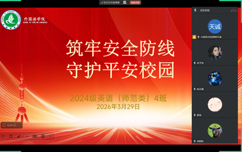 为进一步强化学生安全防范意识,筑牢校园安全防护屏障,切实保障同学们的人身与财产安全,营造安全、稳定、文明、和谐的校园环境。3月29日晚外国语学院开展以“筑牢安全防线 守护平安校园”为主题全面、系统的校园安全教育活动。