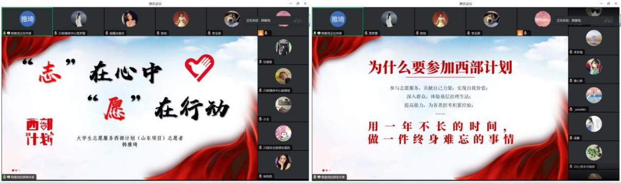 会上,优秀校友们分享交流他们作为“西部追梦人”的青春故事与内心感悟,分别从西部计划项目基本介绍、招募公告、政策保障、日常工作、人文风景和娱乐活动等方面向同学们详细介绍,分享了他们在西部计划的成长经历。西部计划是一个锻炼自己、服务他人的平台,让自己在实践中不断成长、成熟。在这个过程中,他们坚定了理想信念,培养了吃苦耐劳的品质,积累了宝贵的社会经验,呼吁同学们要勇敢担当,敢于创新,积极投身西部计划,贡献自己的一份力量。