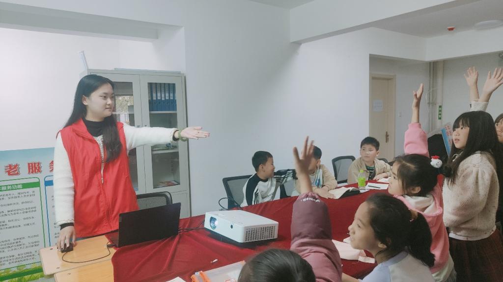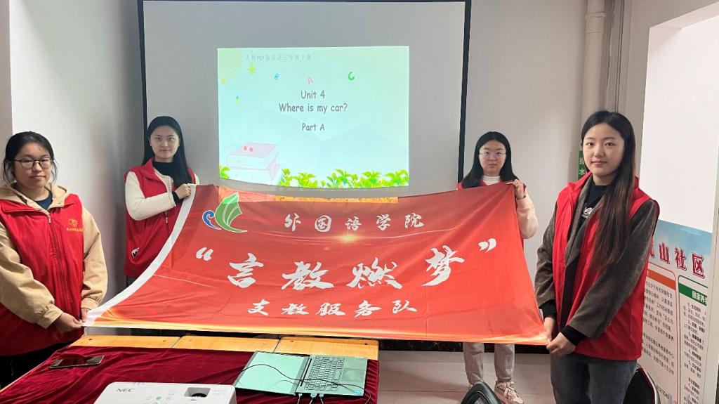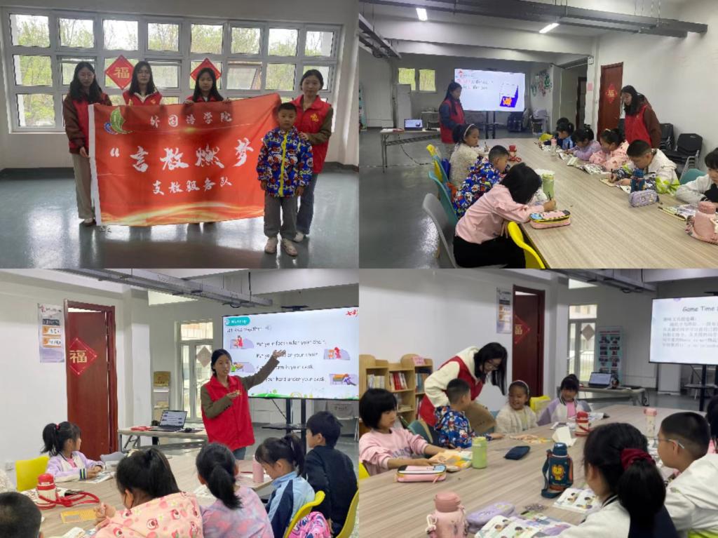 “言教燃梦”志愿服务队的志愿者毛安琪、商智硕、王新雅、江悦四名同学前往瓦山社区,以其独特的教学方式为孩子们带来了一节欢快而又充满知识的英语课。