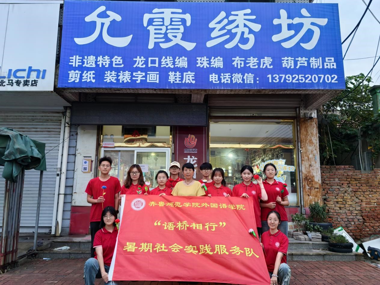 为深入学习贯彻习近平文化思想,传承弘扬中华优秀传统文化,深入挖掘齐鲁文化底蕴,深耕人文沃土,进一步增强历史自信和文化自信。7月16日,齐鲁师范学院外国语学院“语桥相行”三下乡社会实践服务队赴烟台市龙口北马镇允霞绣坊开展“凝聚青春力量,赋能非遗活力”——探“非遗”根脉,助力“非遗”文化宣传推广活动。