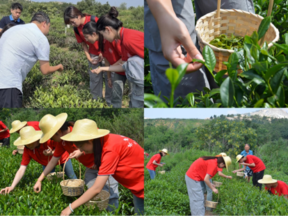 从来没有一杯茶,仅只是茶而已。在台上殷家村月针芽茶园,队员们在茶园负责人徐必乔的带领下,体验采茶制茶,在劳动中领略茶之韵味。漫步茶山,目之所及,皆是生机盎然,微风轻拂,飘来茶香阵阵。徐园长详细地为成员们讲解了采茶的手法和注意事项,并亲自示范了采茶的全过程,首先是采茶,用食指,拇指挟住叶尖幼梗的中部,利用两指的弹力将茶叶摘断。随后,队员们戴上草帽、拿上竹筐开始采茶,细细打量,茶叶新芽在阳光的照耀下,嫩绿欲滴。队员们模仿着茶园负责人的样子,小心翼翼地采摘新芽,顶着烈日,才半小时队员们就已经汗流浃背,腰膝酸软了,而茶篓才堪堪封底,随着队员们竹筐中的新芽越来越多,感受着浓浓的茶香,大家的成就感油然而生。
