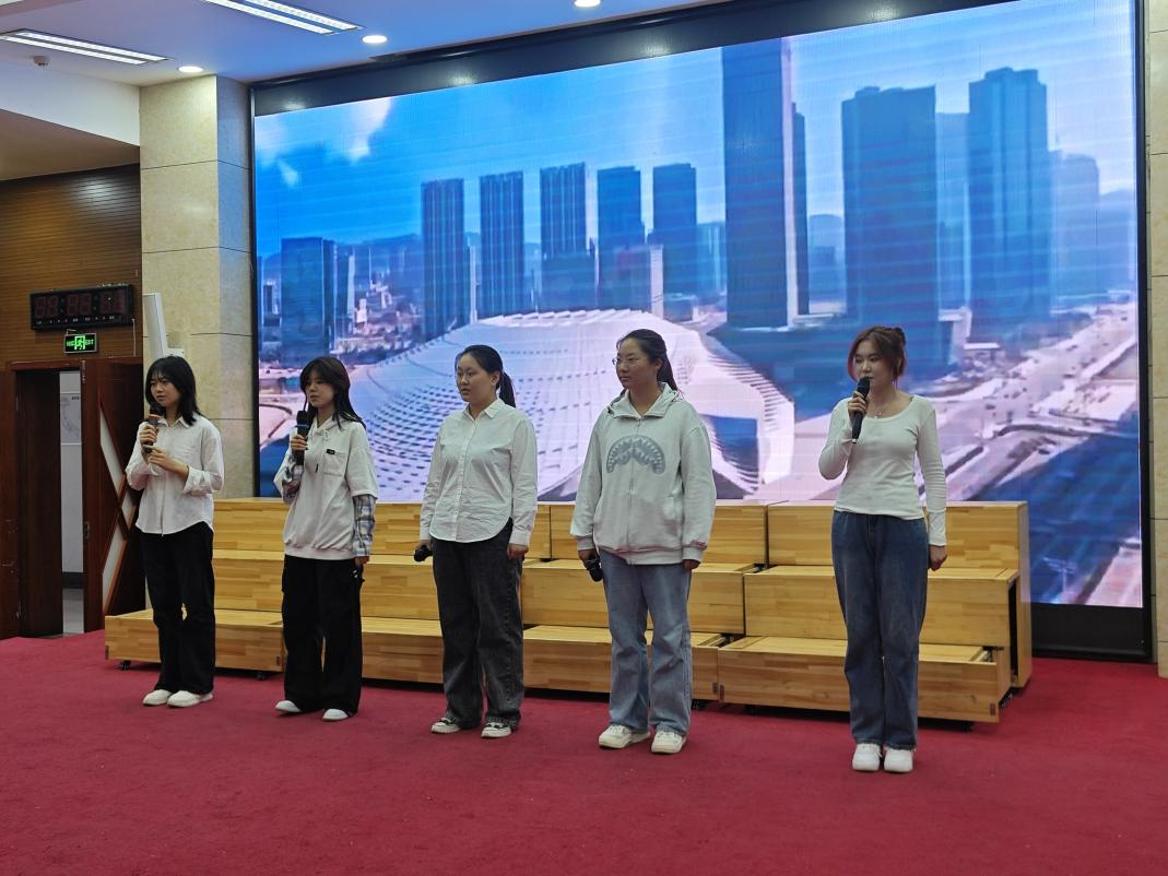 为了庆祝新中国成立75周年,增强班级的凝聚力和向心力,培养同学们的集体荣誉感,同时以歌声传递正能量,展现当代大学生积极向上和奋发有为的精神风貌,外国语学院于10月24日下午在图书馆第一报告厅举办“唱响新时代,勇踏新征程”班歌比赛活动,来自2023级和2024级15个班集体参加了班歌比赛。外国语学院副院长谢士金,党委副书记迟英娟,团总支书记牛荦,辅导员王凯、吴昊老师出席此次活动。本次活动由刘睿婷和郭天诚主持。
