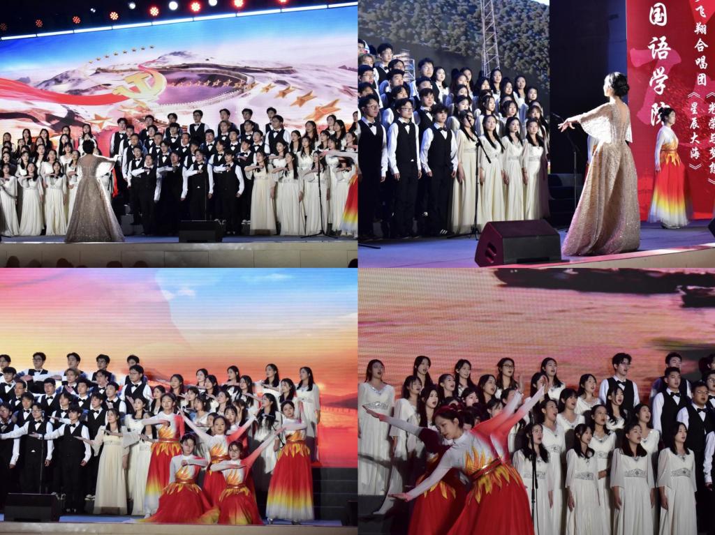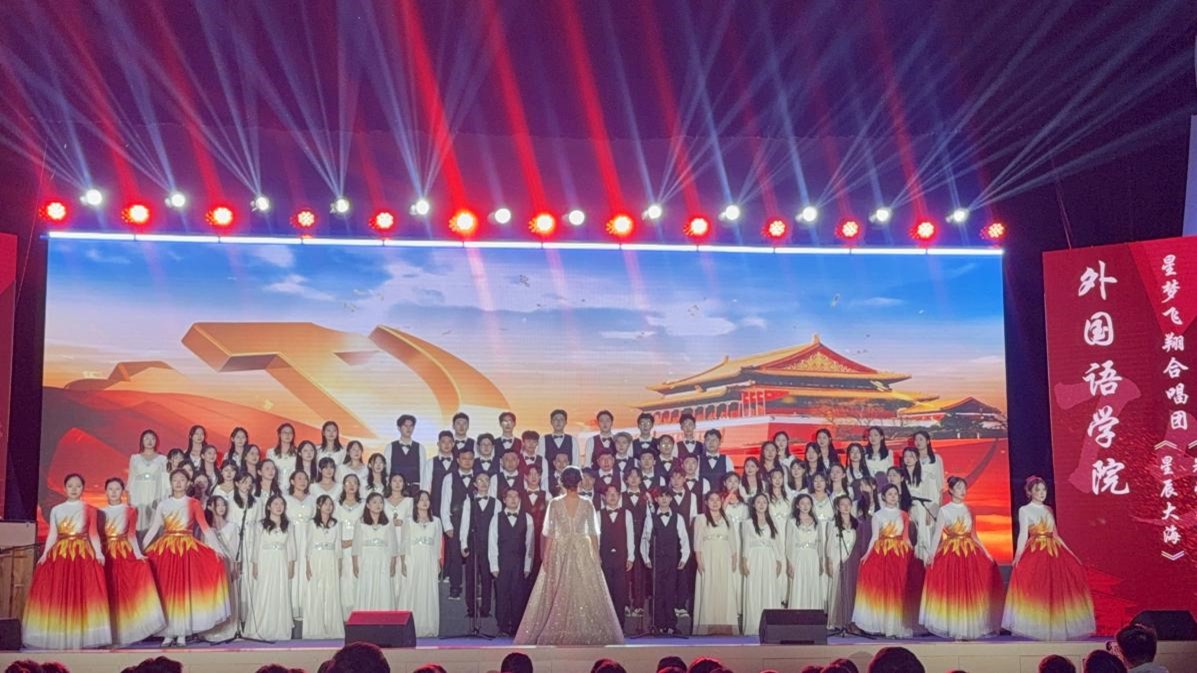为热烈庆祝中华人民共和国成立75周年,弘扬伟大爱国主义精神,激发广大青年学子的爱国热情,展现当代大学生朝气蓬勃、积极向上的精神风貌。11月28日晚,外国语学院积极组织师生参加学校组织的“青春之声颂华诞”第二届大学生合唱节暨主题党团日活动,学院共90名师生参加此次合唱比赛。