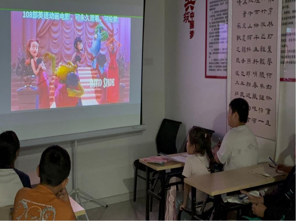 我们认为让孩子们学好英文的第一步应该是喜欢上学英文,所以在完成这一次的教学任务和对孩子们作业的指导后,给孩子们放了一个简短的有趣的英文动画电影片段,让他们在欢声笑语中喜欢上英文,对英文产生浓厚的兴趣,这也是教育的目标之一。效果非常的好,大家看得意犹未尽,我们一起讨论剧情,也在不知不觉中拉近了彼此的距离。