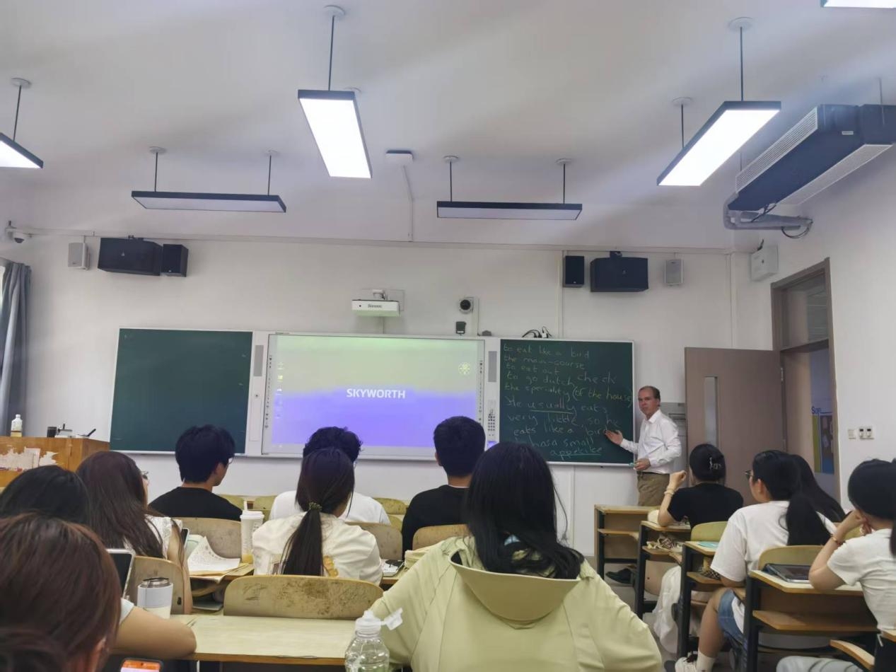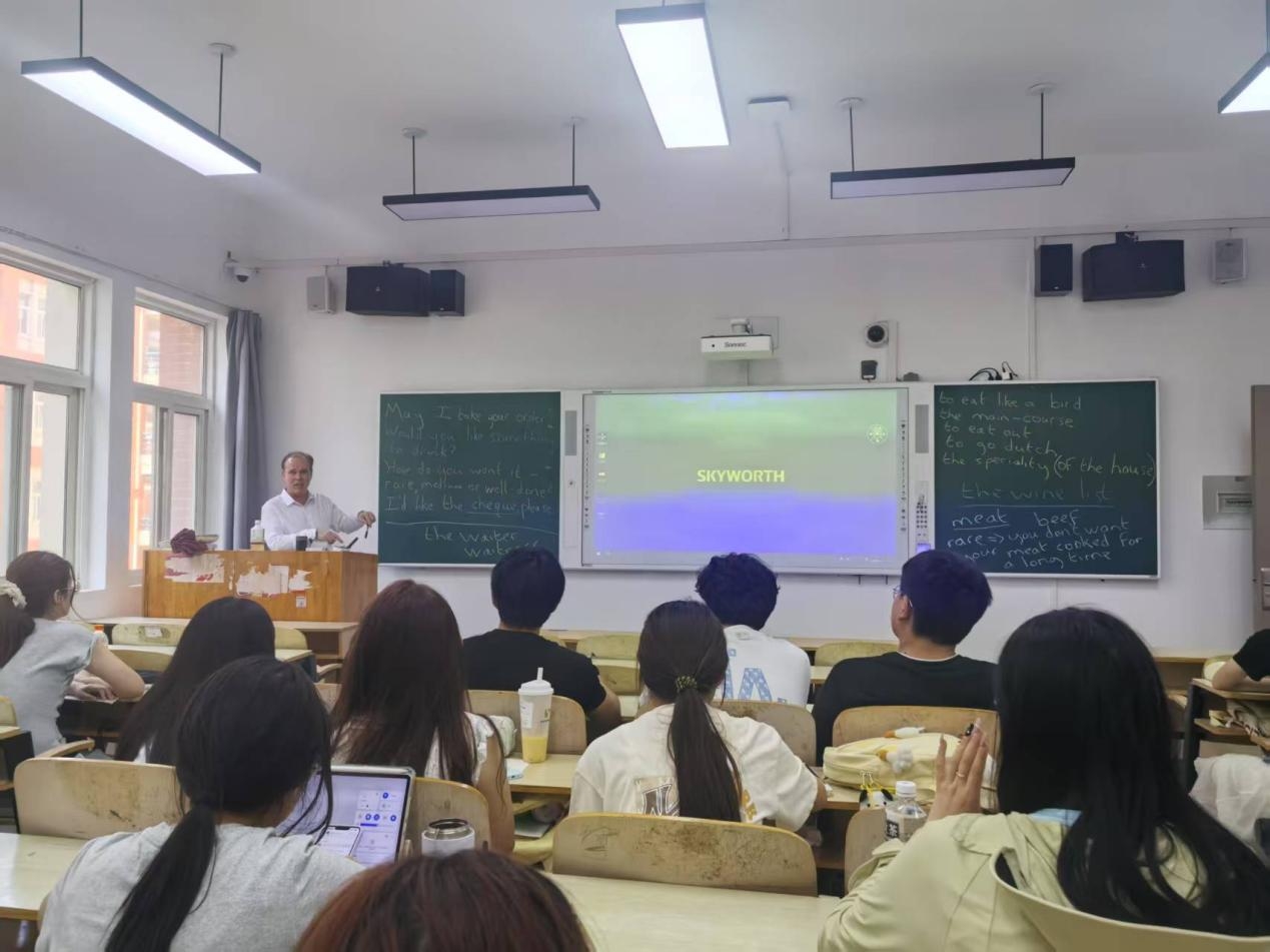 活动伊始,Eugene以模拟餐厅场景的形式,带领大家学习日常用餐礼仪话语。从入座时的 “May I take this seat?” 到点餐时的 “Could you recommend the house special?”,再到结账时的 “Separate checks, please.”,Eugene的每一句实用英语都配合文化背景讲解,让同学们在学习语言的同时,了解不同国家的餐桌礼仪细节。紧接着在互动交流环节将活动氛围推向高潮。同学们分组模拟餐厅场景,分别扮演顾客、服务员与食客同伴,用英语练习各类用餐对话。在模拟过程中,大家灵活运用刚学到的礼仪用语,不仅提升了英语口语能力,还深入体验了不同文化中的交流习惯。现场设置了 “礼仪纠错” 趣味问答,同学们积极抢答,在欢声笑语中巩固知识。