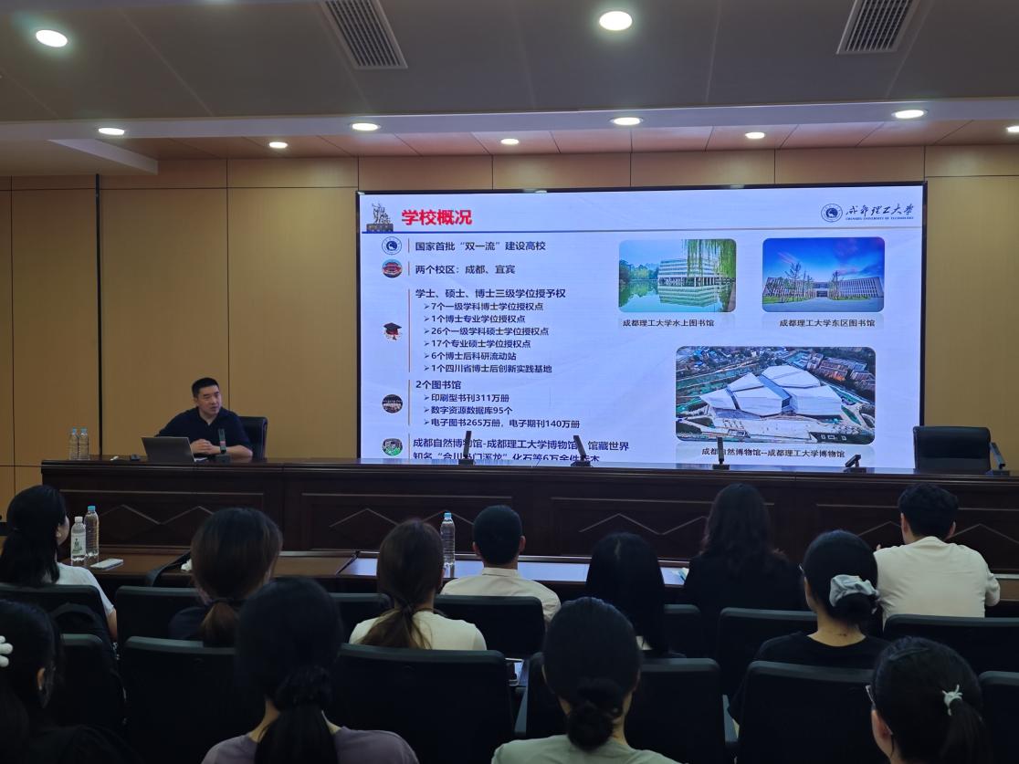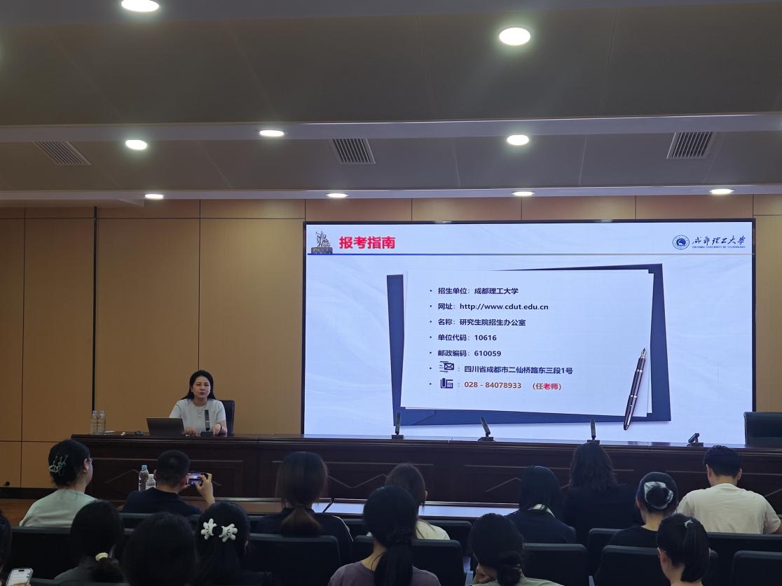 为进一步提升考研指导服务效能,助力学生深度了解招生动态、科学规划学业发展路径,5月20日,外国语学院在二教A111举办成都理工大学2025届翻译硕士招考专场宣讲会。成都理工大学外国语学院研究生部主任钟蔚、副主任孟嵊,外国语学院党委副书记迟英娟、副院长陈锋、团总支书记牛荦,以及学院部分学生参加会议。