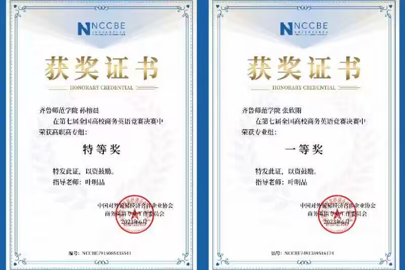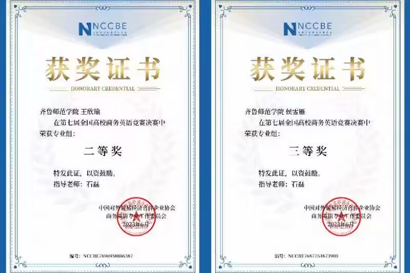 6月20日,由中国对外贸易经济合作企业协会指导,中国对外贸易经济合作企业协会商务英语专业工作委员会主办的第七届全国高校商务英语竞赛圆满结束。齐鲁师范学院外国语学院56名同学在大赛中获佳绩。其中,2021级商务英语专业孙榕晨等4名同学获决赛特等奖,张欣雨等2名同学获决赛一等奖,王欣瑜等14名同学获决赛二等奖,侯雪雁等36名同学获决赛三等奖,齐鲁师范学院获“最佳组织奖”。