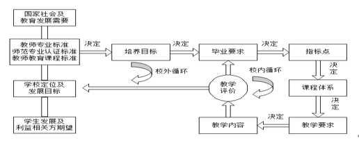 各专业根据山东省基础教育师资人才需求,分别参照教育部《中学教育专业认证标准》《小学教育专业认证标准》《学前教育专业认证标准》,围绕学校的办学定位与人才培养特色,与中、小学及幼儿园联合确定专业培养目标,依据培养目标确定毕业要求,制订毕业要求支撑对培养目标的关系矩阵,根据毕业要求构建课程体系,制订开设课程与毕业要求的对应关系矩阵。各专业必须清晰呈现培养目标和毕业要求、毕业要求和课程体系、能力结构与实践课程体系之间的支撑关系,并在教学过程中以相关教学策略和方法实现能力培养,同时须建立质量评价和持续改进制度,保障人才培养质量。