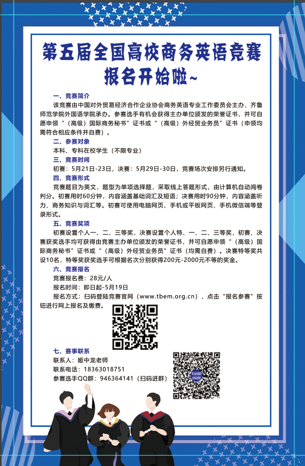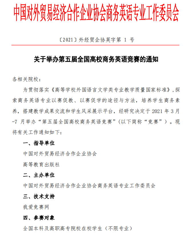 全国高校商务英语竞赛由中国对外贸易经济合作企业协会商务英语专业工作委员会主办,竞赛题目为全英文,采取计算机闭卷+在线智能监考考试形式进行,内容涵盖商务英语听力、商务综合知识与词汇、语法等。此次竞赛共有全国1700多所高校共计26000余人报名参赛,最终共有10100人晋级全国线上总决赛。