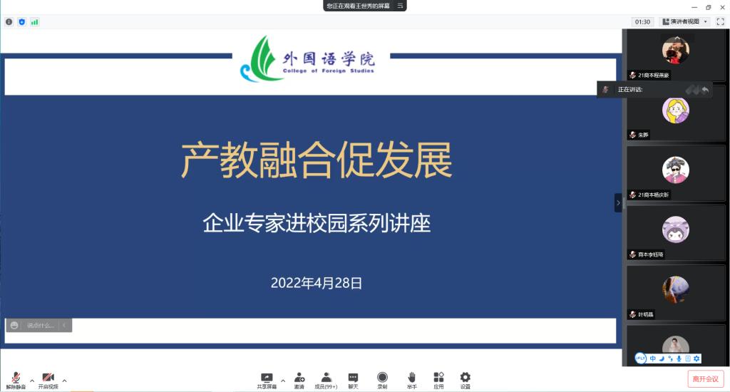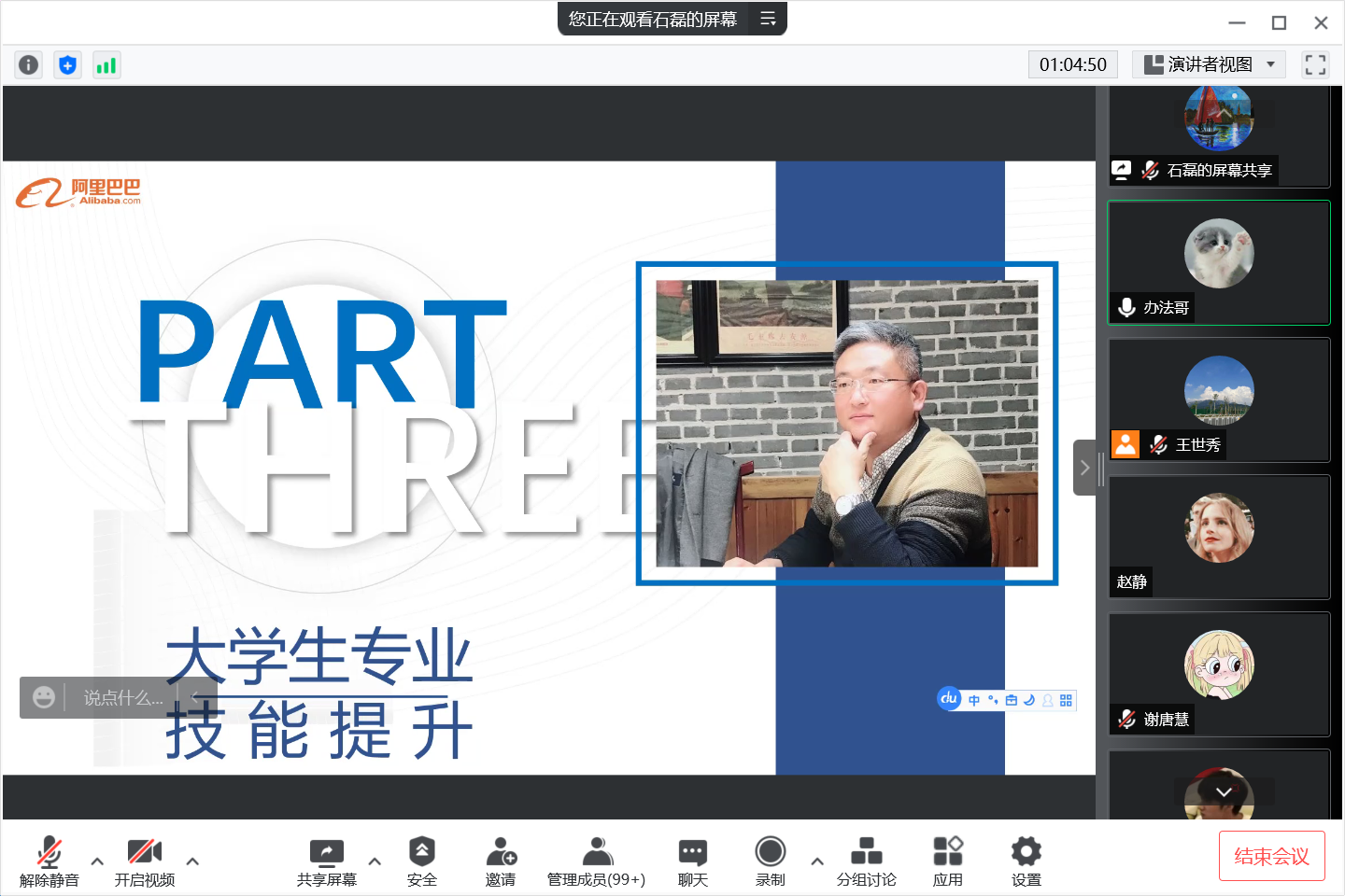 2022年4月28日下午,商务英语教研室特邀阿里巴巴济南分公司总经理聂孟昌先生开展题为“国际外贸人才需求与大学生专业技能提升”的线上讲座。本次讲座由商务英语教研室主任石磊主持,商务英语专业全体任课教师和学生参加了讲座。