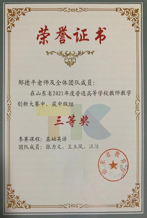 由山东省教育厅主办的2021年度山东省普通高等学校教师教学创新大赛,于4月11日顺利结束。在外国语学院领导的精心组织和大力支持下,由邹德平、张力文、王玉凤、汪洁组成的《基础英语》教学团队斩获“中级组” 三等奖。