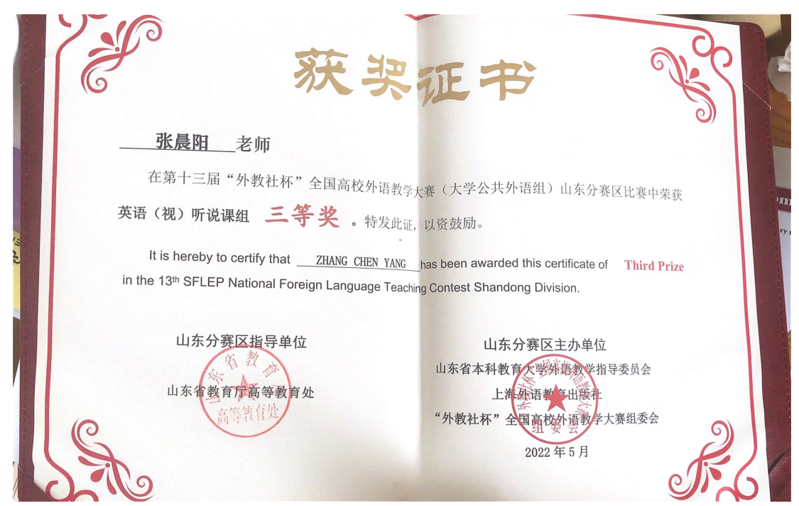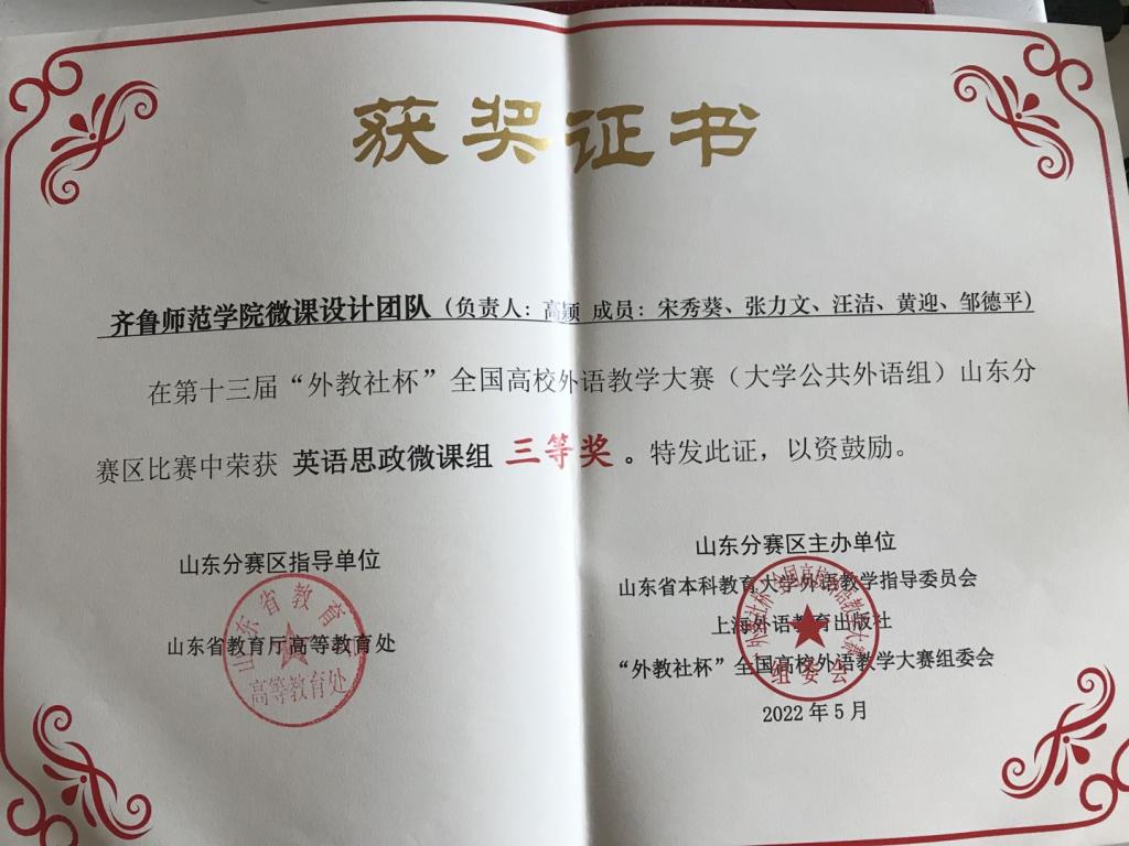 5月5日,第十三届“外教社杯”全国高校外语大赛山东赛区线上决赛圆满结束,在外国语学院领导的精心组织和支持下,我院青年教师张晨阳斩获“视听组”省赛三等奖;由高颖、宋秀葵、张力文、汪洁、黄迎、邹德平组成的微课设计团队斩获“英语思政微课组”省赛英语思政微课组 三等奖。