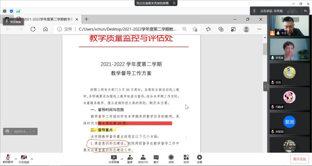 宋秀葵带领全体教师学习了《2021-2022学年度第二学期教学督导工作方案》,重点强调了如何有效开展线上教学工作。宋秀葵指出,教师应加强课堂意识形态建设,注重课程思政,传播正能量,做好学生引导工作;线上教学应严格按照教学计划进行,强化课程目标意识;教师应加强在学生线上自主学习时间段的参与度,做好课堂管理工作,提高线上学习过程中的互动性。随后,宋秀葵针对二级学院考核工作和学院教科研工作进行了部署和安排。