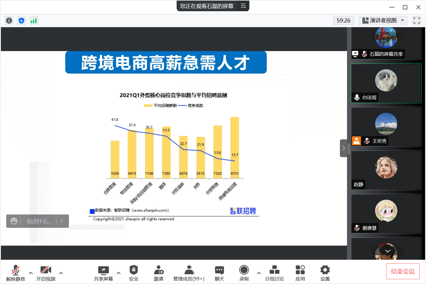 为深度推进校企合作,加深学生对行业企业的了解,外国语学院举办了“企业专家进校园”系列讲座。4月28日下午,学院特邀阿里巴巴济南分公司总经理聂孟昌先生开展题为“国际外贸人才需求与大学生专业技能提升”的线上讲座。本次讲座由商务英语教研室主任石磊主持,商务英语专业全体任课教师和学生参加了讲座。