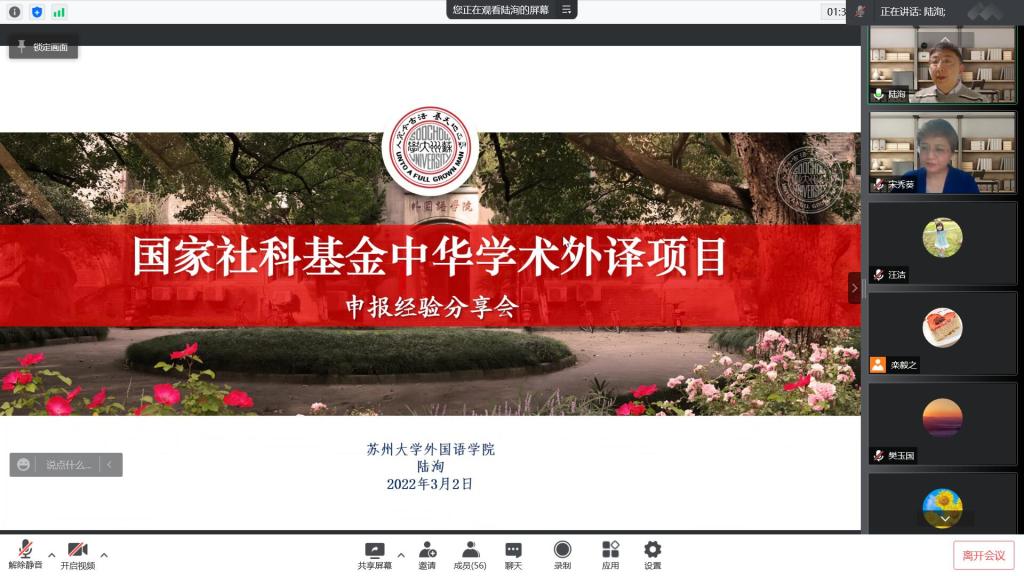 随后,陆洵教授详细介绍了中华学术外译项目近三年申报情况概览,根据自身申报经验对2021年的项目申报要点进行了细致解读,并分享了项目申报过程中的个人体会,以帮助老师们在日后的中华学术外译项目申报中克服困难。
