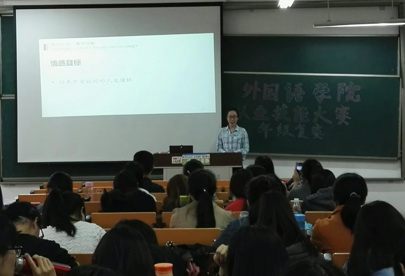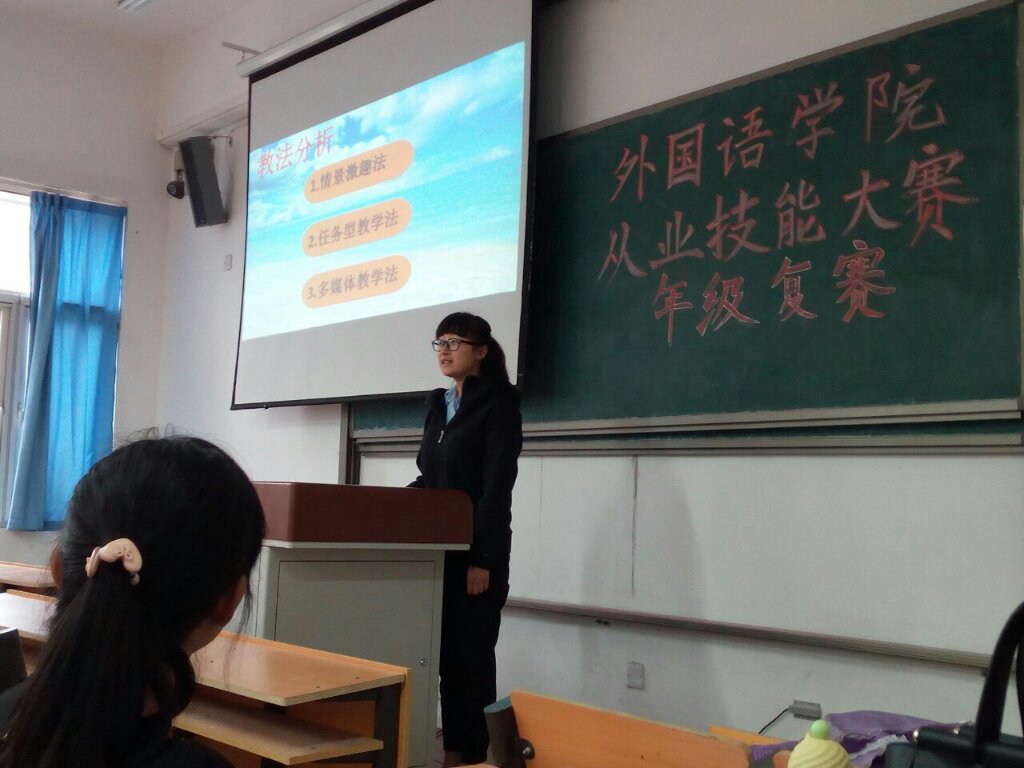 复赛比赛形式为说课,每位参赛选手有八分钟的说课时间,评委由各班指导教师担任,比赛结果由评委老师共同商议决定。比赛过程中,选手们仔细透彻地分析教材及学情,并制定合理的教学计划,大家的精彩表现赢得了评委老师及同学们的阵阵掌声。最终,2013级英语(师范类)专业蒋艺、马璇、谭英琦、贾竹青;2014级英语(师范类)专业程行;2015级英语(师范类)专业杜葳晋级决赛。
