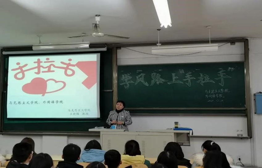 为把握建设高质量教育体系的新要求,积极响应我校加强学风建设、促进全校教育资源互通互联的号召,外国语学院与马克思主义学院于12月10日下午在一教A207开展“学风路上手拉手”考研活动。出席本次活动的有马克思主义学院党总支书记王晓梅、外国语学院党总支副书记郁志营、马克思主义学院教师陈赟、外国语学院辅导员王伟以及两学院2020级具有考研意向的本科班同学。本次活动由王晓梅主讲。