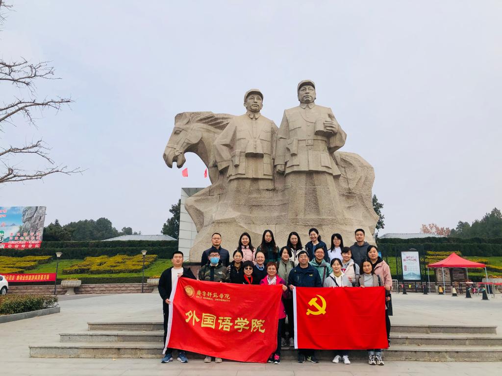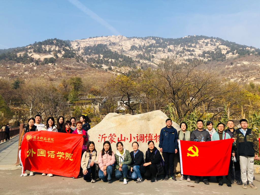 为进一步深入学习贯彻落实党的十九大精神和习近平总书记视察山东重要讲话、重要指示批示精神,深化“不忘初心、牢记使命”主题教育效果,结合现场教学深刻领会习近平新时代中国特色社会主义思想,进一步加强党员党性教育,增强基层党支部的凝聚力、战斗力和创造力,11月14日至11月15日,外国语学院党总支组织学院教师党员,赴临沂孟良崮战役纪念馆、红嫂革命影视基地、沂蒙山小调活态博物馆开展主题党日暨革命史教育活动。