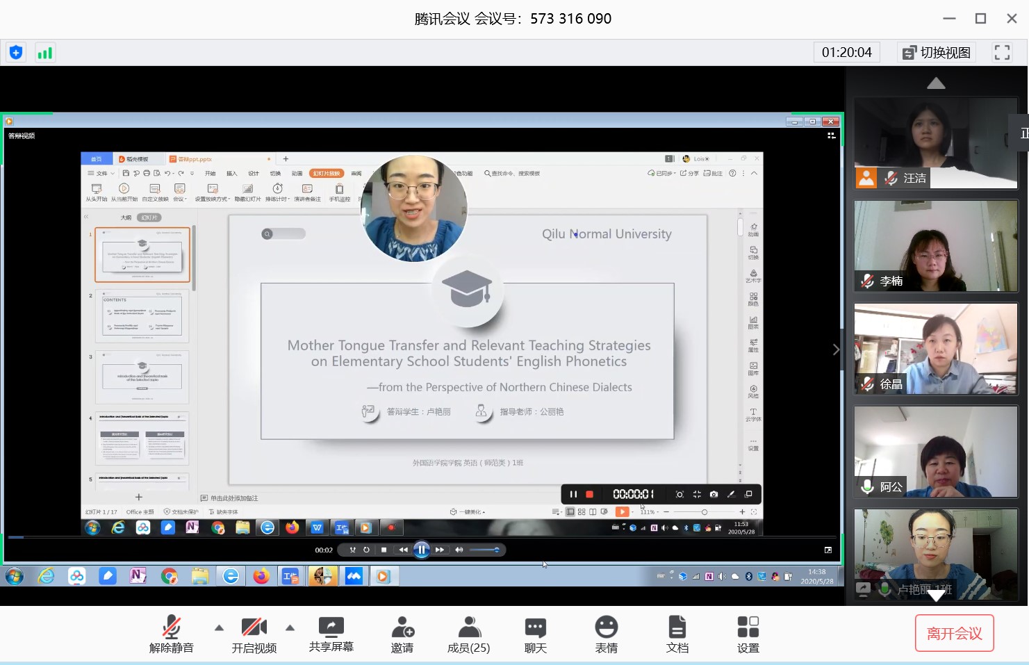 本次线上论文答辩采用腾讯会议进行,严格遵循线下答辩的程序和质量标准。通过全程视频和在线演示学位论文PPT的方式,学生与答辩老师进行实时交流。答辩学生陈述结束后,答辩老师依次提问,并提出修改意见。答辩秘书对答辩过程全程录音录像,对关键画面截屏,与答辩记录一并留存,实现答辩过程可回溯、可复查,以确保线上答辩质量。老师和学生们都表示,本次线上答辩组织严谨,流程规范,令人终生难忘。