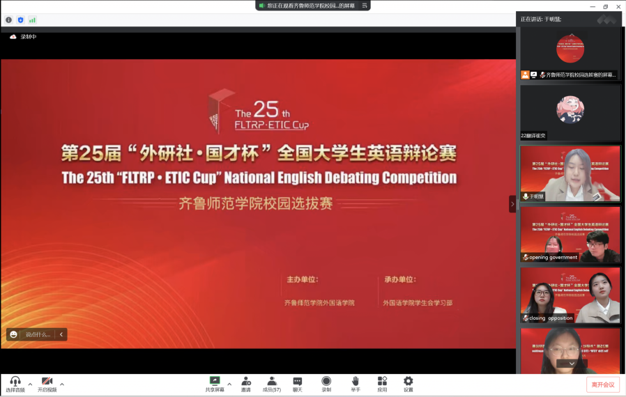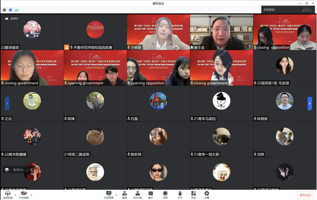 为引导外国语学院学生积极践行社会主义核心价值观,加强校园文化建设,帮助学生开拓国际视野、强化学习意识,提升英语表达和思辨能力,培养兼具家国情怀和全球视野的国际沟通与传播人才,外国语学院于3月21日晚线上举办了第25届“外研社·国才杯”全国大学生英语辩论赛校园选拔赛决赛。外国语学院副院长谢士金、商务英语教研室主任石磊、英语专业教研室主任林德奖、陈锋博士、办公室副主任汪洁和青年教师刘烨担任评委。