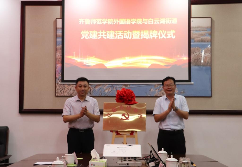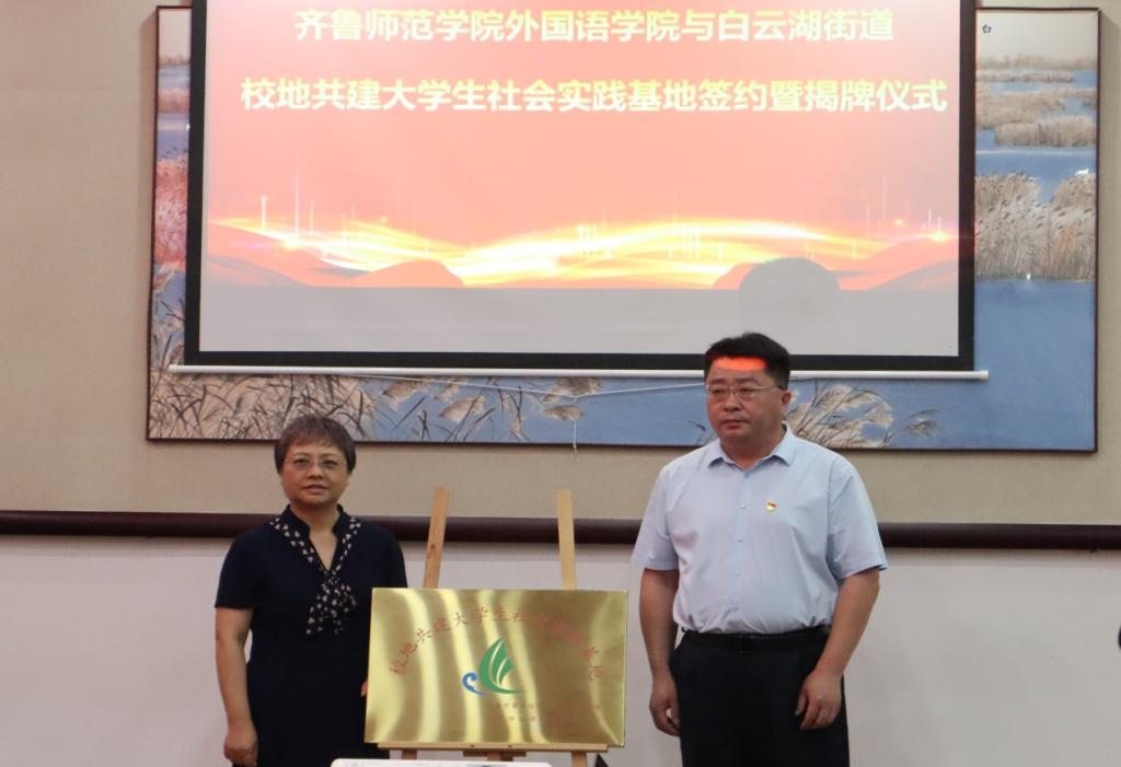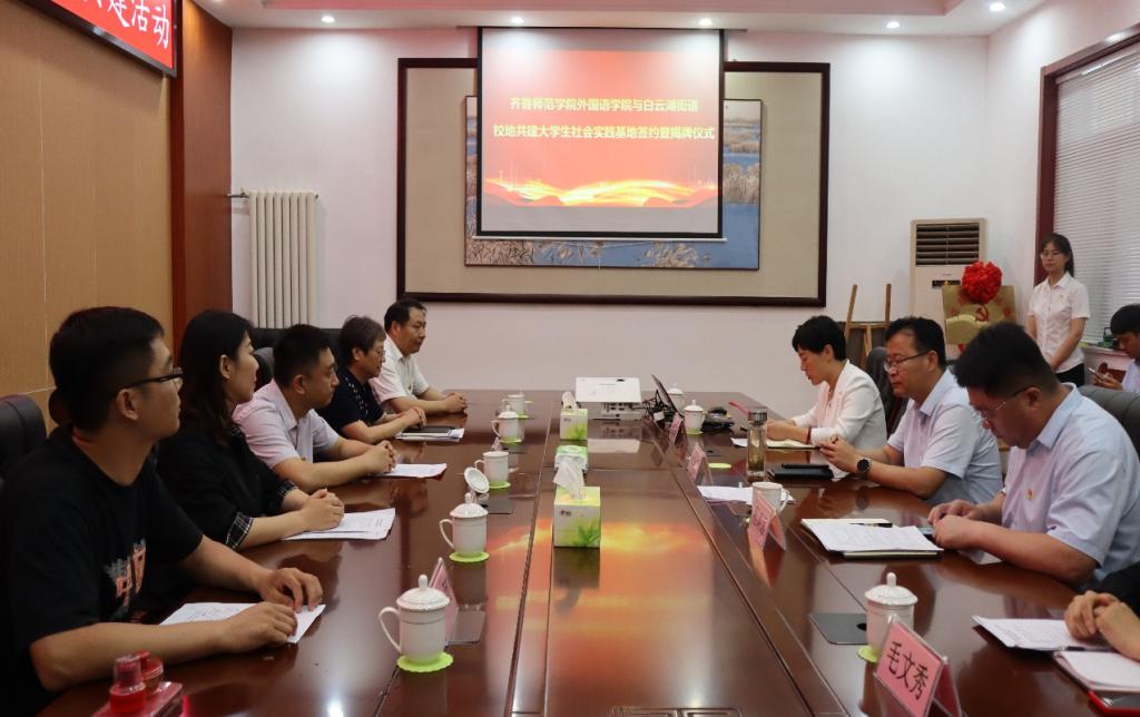 为推动学习贯彻习近平新时代中国特色社会主义思想主题教育走深走实,进一步强化党建引领,推进校地融合、双向共建,搭建大学生社会实践平台,7月13日上午,外国语学院与章丘区白云湖街道举办“党建共建暨大学生社会实践基地”签约揭牌活动。外国语学院党委书记于江、院长宋秀葵,白云湖街道党工委书记袁致甲、办事处主任程涛远,外国语学院副书记迟英娟、副院长谢士金,白云湖街道党工委副书记董丽芳、组织委员毛文秀出席签约揭牌仪式;外国语学院辅导员邵河以及15名暑期“三下乡”社会实践服务队队员参加仪式。