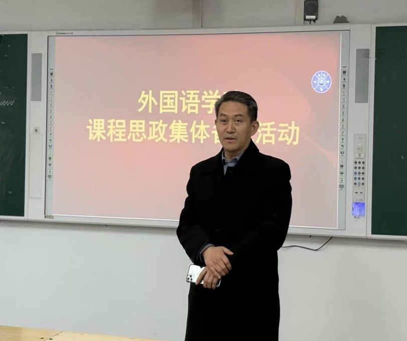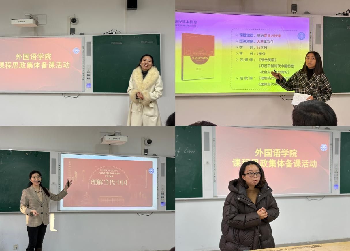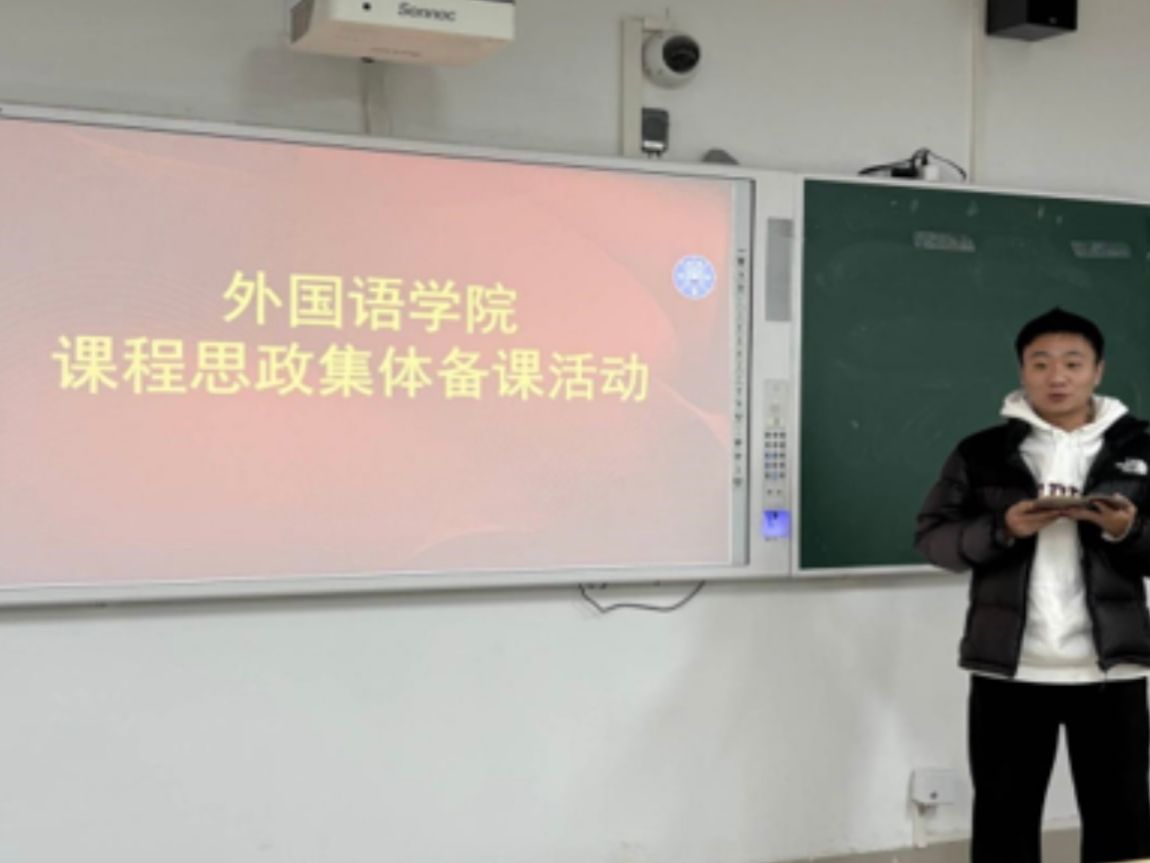 为深入贯彻落实立德树人根本任务,推动课程思政高质量落地,根据齐鲁师院政教字〔2025〕41号文件《齐鲁师范学院专业课教师与思政课教师、辅导员集体备课和听课助讲实施方案》要求,12月4日,外国语学院在二教B214组织开展英语课程思政集体备课活动。活动由专业课教师、思政课教师与辅导员三支队伍共同参与,切实加强协同育人机制建设。外国语学院院长宋秀葵、马克思主义学院院长赵立峰、辅导员吴昊、高晨轩及全体英语专业教师参加了活动。