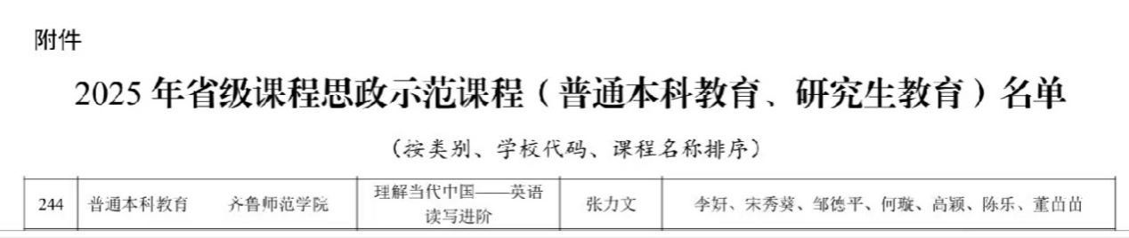近日,山东省高等学校课程思政研究中心公布2025年课程思政评选结果,我院张力文老师负责的《理解当代中国——英语读写进阶》成功入选,其教学团队创新构建的外语课程思政教学模式获高度认可,为同类课程建设提供了可复制、可推广的实践范例。