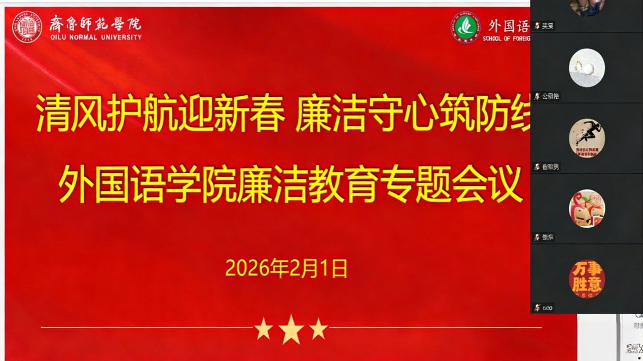 为深入贯彻全面从严治党要求,持续强化师德师风建设,扎实推进清廉师院建设走深走实,切实筑牢全体教师廉洁自律思想防线,确保度过一个风清气正、文明祥和、安全有序的新春佳节,2026年2月1日,外国语学院通过腾讯会议平台召开廉洁教育专题会议。学院全体教师齐聚线上,共同接受廉洁警示教育与纪律作风提醒,以廉洁自律的实际行动为清廉师院建设注入强劲动力。