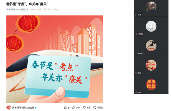 随后,会议组织全体教师专题学习了学校纪检监察公众号推送的《春节是“考点”,年关亦“廉关”》推文。学院党委书记于江结合推文精神与清廉师院建设总体要求,,围绕节日期间廉洁自律、师德师风建设等核心要求,向全体教师提出明确要求。他强调,春节是人情往来的密集期,更是检验教师廉洁作风的“关键考点”,全体教师要深刻认识“年关”即“廉关”的重要意义,时刻绷紧廉洁自律这根弦,自觉抵制各类不正之风与违规违纪行为。要严格遵守廉洁从教各项规定,严禁违规收送礼品礼金、电子红包等节礼,严禁违规接受学生及家长的宴请、旅游安排等利益输送行为,坚决维护教师队伍的良好形象,共同营造清廉育人的良好生态。