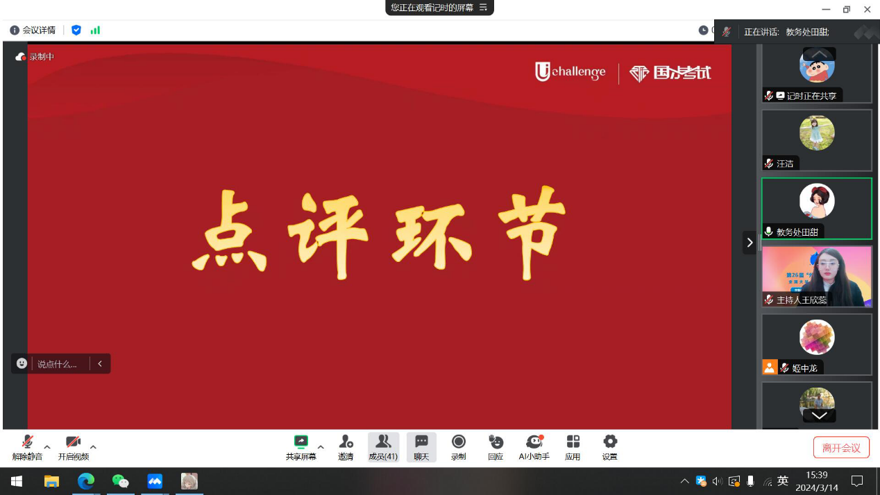 教务处副处长田甜与外国语学院副院长陈锋均对辩手们的精彩表现予以高度认可。田甜深入剖析了辩手们在辩论技巧、论据支撑、逻辑结构以及语言表达等方面的出色表现,并提供了宝贵的反馈与建议,鼓励同学们积极参与辩论活动,不断提升思辨能力。她特别肯定了外国语学院在学科竞赛中的优异表现,希望同学们能珍惜机会,为未来的学术研究和职业发展打下坚实基础。陈锋则对教务处的支持表示感谢,他强调外国语学院将继续深化与教务处的合作,认真组织好承办的各类学科竞赛,培养和选拔出更多更优秀的外语创新型人才。