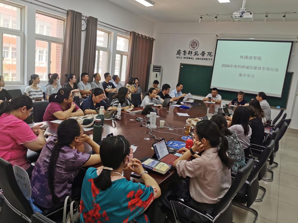 2024年6月13日下午,外国语学院开展全体教师的科研诚信建设集中学习,学习由院长宋秀葵主持,学院全体教师参加了学习。