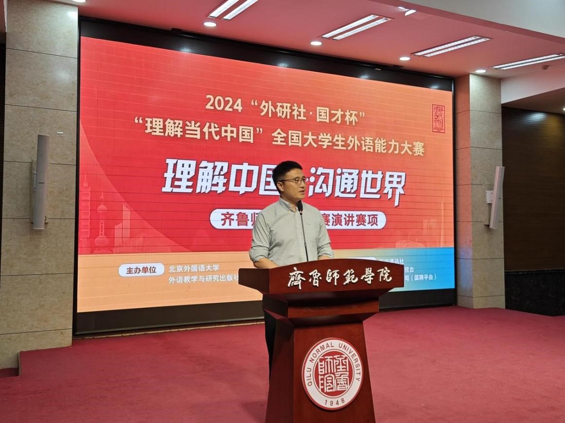 在比赛尾声,评委组代表林德奖老师对参赛选手们进行了点评。他首先对学生在比赛中展现出的专业水准和家国情怀给予充分肯定,同时也指出选手在演讲过程中的不足,给予专业指导,并强调语言的学习是一个漫长的过程,同学们要有足够的激情和毅力,未来才能够在不断学习和实践中提升自己的外语能力。