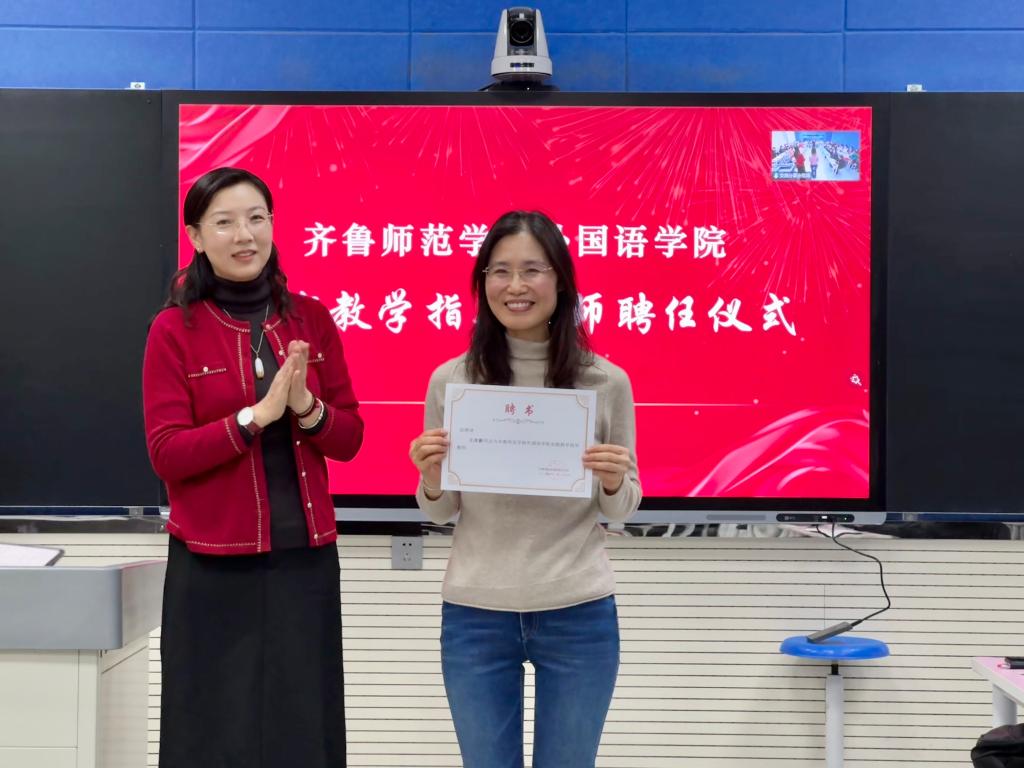 随后,赵青向外国语学院特聘教学实践指导王冰新颁发了聘书,并对王冰新两度援疆支教,为麦盖提县英语教学做出的贡献及取得的成绩表示敬佩,她鼓励支教团成员向王冰新学习,积极为麦盖提县的英语教学事业贡献自己的智慧和力量。聘请王冰新为指导教师,是为了更好的指导学生开展教学、教研、管理等工作,也是落实学校校内校外双导师制的重要举措。