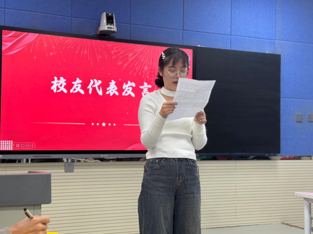 校友代表吕瑞霞在听了支教团成员的分享后,对支教团成员的辛勤付出和取得的成果表示赞赏和鼓励,并就母校对学生实习支教工作的大力支持表示感谢。她以自己的亲身经历激励在座同学,要勇于面对挑战、坚持教育梦想,为边疆教育事业贡献自己的青春和力量。