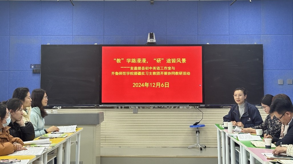 为深化麦盖提县英语教学改革,提升教学质量,进一步增强教师的教学研究能力,12月6日下午,齐鲁师范学院第六批援疆实习支教团与日照援疆教育发展中心在麦盖提县第四中学成功举办协同教研活动。此次活动由日照援疆教育发展中心副主任、麦盖提县第一小学副校长王冰新主持,日照援疆教育发展中心副主任常德义、齐鲁师范学院第六批援疆实习支教团领队、信息科学与工程学院党委书记赵青、第六批援疆实习支教团带队、外国语学院专任教师汪洁、麦盖提县初中英语骨干教师及实习支教学生代表参加了活动。