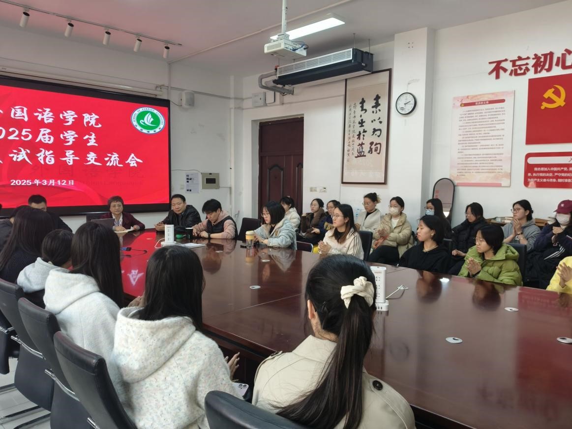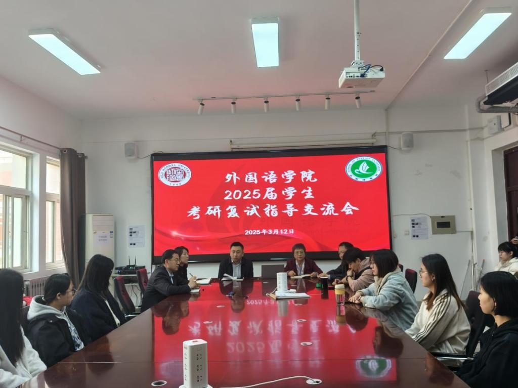 为助力2025届考研学子高效备战复试,更好熟悉复试流程、掌握复试技巧、增强备考信心,外国语学院于3月12日下午在二教B216会议室举办考研复试指导交流会。学院党委书记于江,院长宋秀葵,副院长谢士金、陈锋,党委副书记迟英娟,团总支书记牛荦,辅导员刘欣欣出席会议,2025届全体参加考研复试学生参加会议。会议由牛荦主持。
