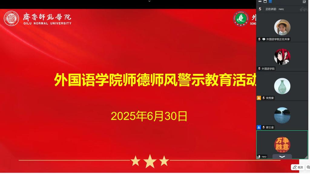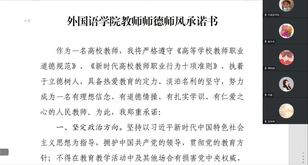 为扎实推进深入贯彻中央八项规定精神学习教育,进一步加强我院师德师风建设,抓好常态化师德教育,规范教师职业行为,6月30日,外国语学院组织开展师德师风警示教育活动。本次会议采用线上形式开展,学院全体教师参加会议。会议由学院党委书记于江主持。
