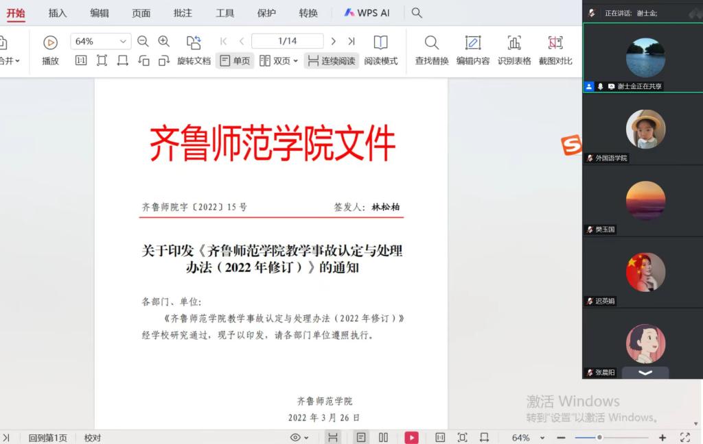 最后,全体教师集体学习了《齐鲁师范学院教师教学工作规范》《齐鲁师范学院教学事故认定与处理办法》等相关教学管理规定并进行了详细解读。会议强调教学工作是学校的中心工作,全体教师要严格遵守教学规范,认真履行教学职责,确保教学质量。对于违反教学规定的行为,学校将严格按照相关规定进行处理,绝不姑息迁就。