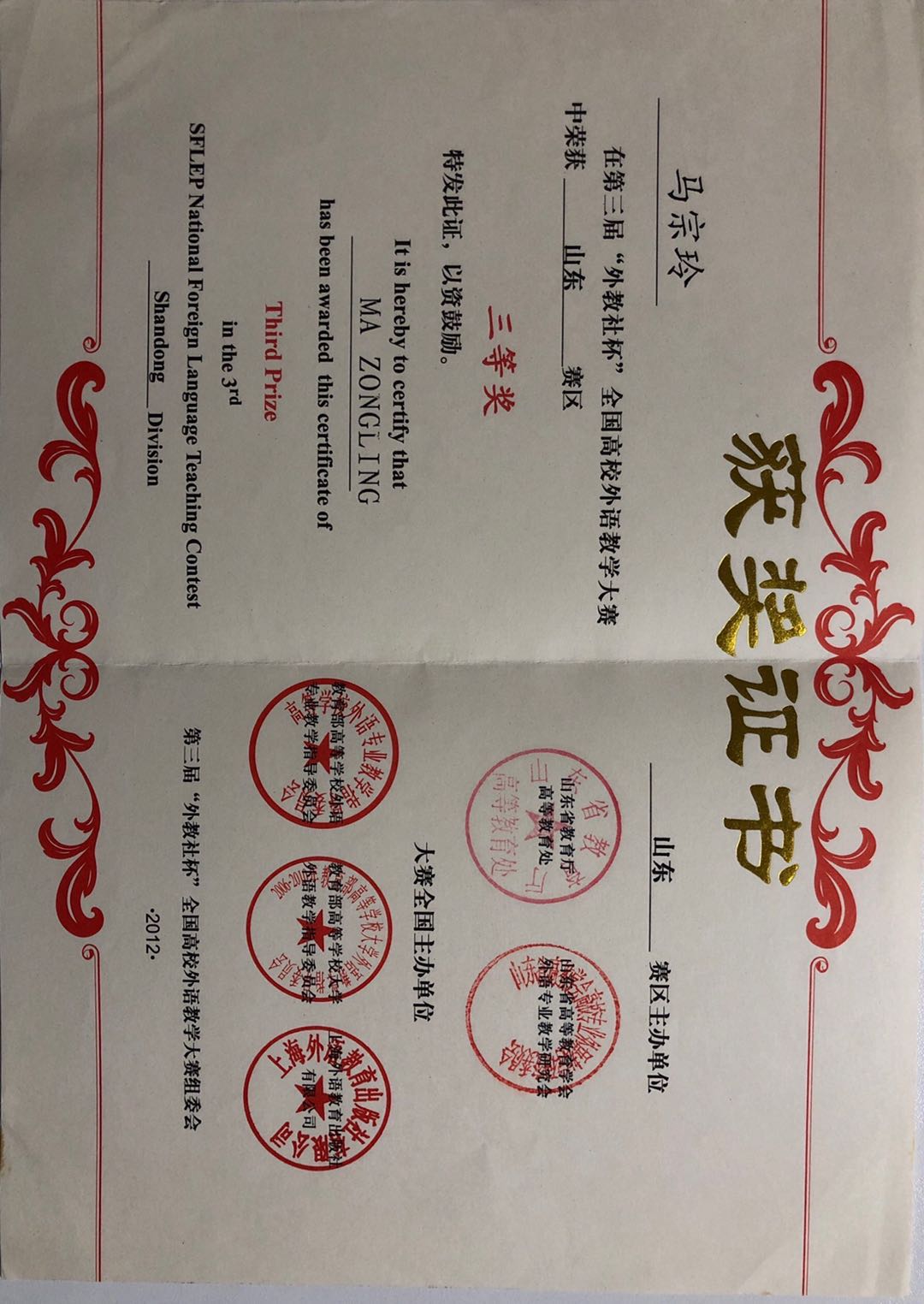 马宗玲老师在2012第三届“外教社杯”全国高校外语教学大赛中荣获山东赛区三等奖。
